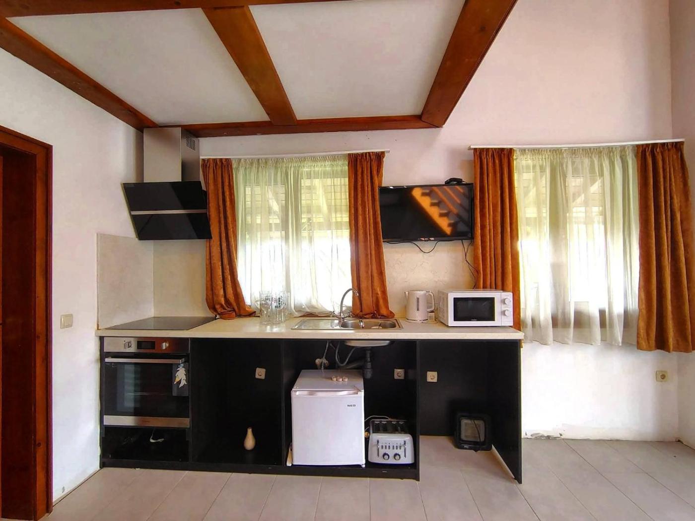 Large Double Room. Guests can make meals in the kitchenette that features a stovetop, a refrigerator, kitchenware and an oven. The spacious double room features soundproof walls, a seating area, a terrace with garden views as well as a private bathroom boasting a shower. The unit has 2 beds.