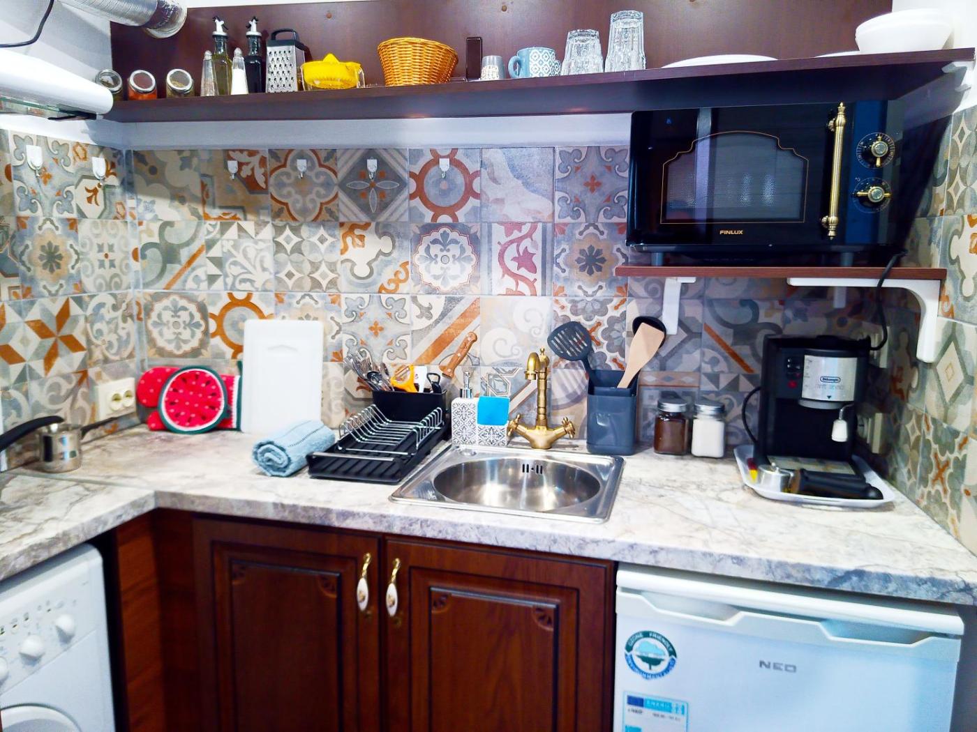 One-Bedroom Apartment. The air-conditioned apartment features 1 bedroom and 1 bathroom with a shower and a hairdryer. The kitchenette comes with a refrigerator, kitchenware and a microwave. The apartment has parquet floors, a seating area with a flat-screen TV with satellite channels, a washing machine, a coffee machine, as well as a dining area. The unit offers 1 bed.