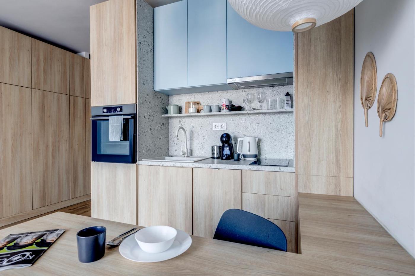 Apartment. The air-conditioned apartment has 1 bedroom and 1 bathroom with a shower and a hairdryer. The well-equipped kitchen features a stovetop, a refrigerator, a dishwasher and an oven. The apartment features a washing machine, a tea and coffee maker, a wardrobe, heating and a flat-screen TV with cable channels. The unit has 1 bed.
