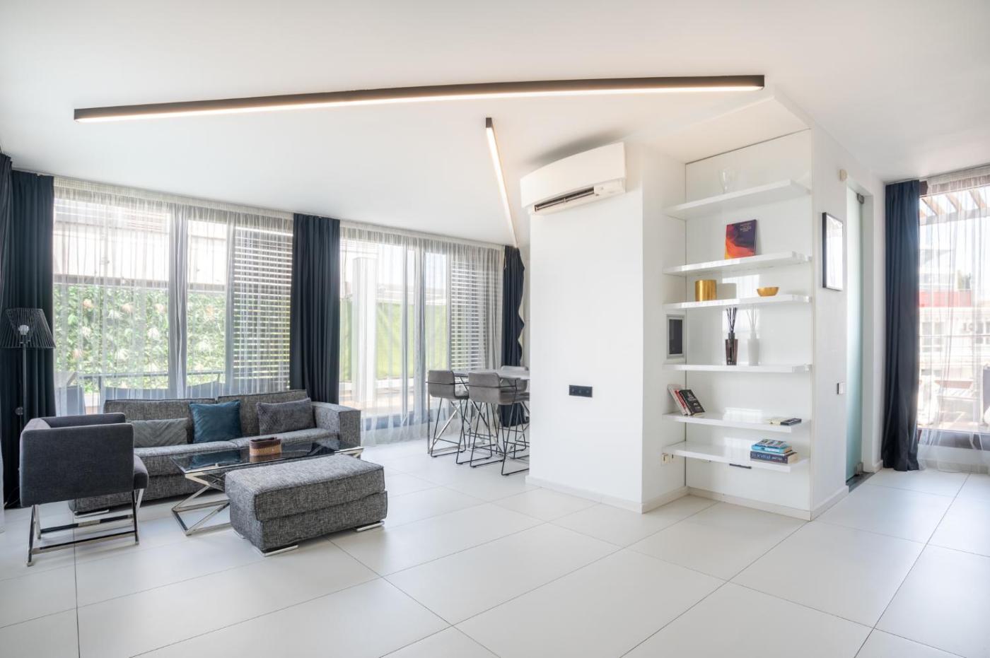 One-Bedroom Apartment. The fireplace is a top feature of this apartment. Boasting 1 bedroom, this spacious apartment has 1 bathroom with a shower, a seating area and terraceyou can relax. In the well-fitted kitchen, guests will find a stovetop, a refrigerator, a dishwasher and kitchenware. The air-conditioned apartment features a flat-screen TV with satellite channels, a washing machine, a tea and coffee maker, a dining area as well as mountain views. The unit offers 1 bed.