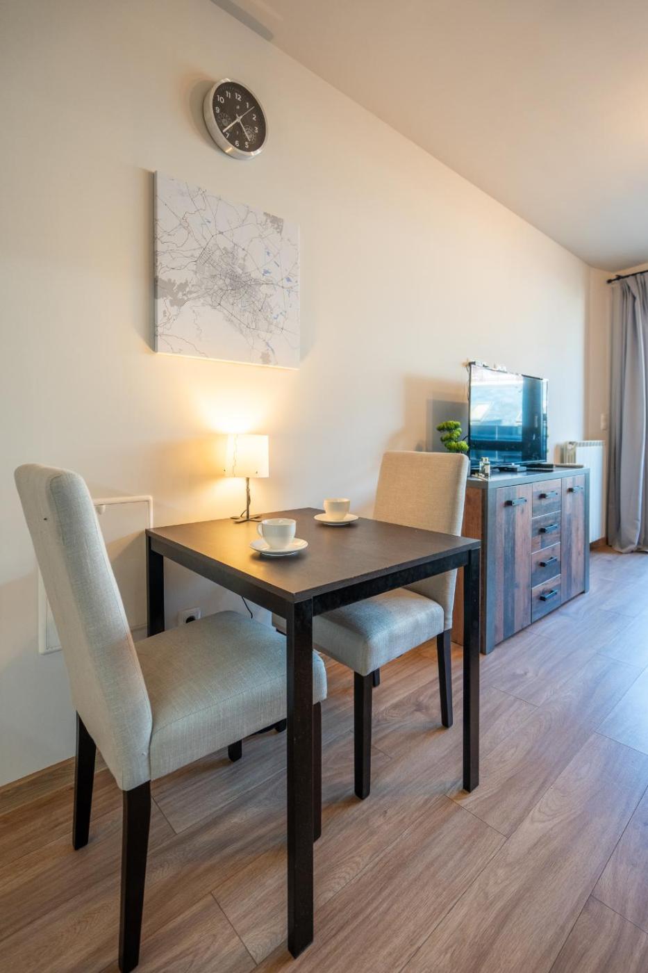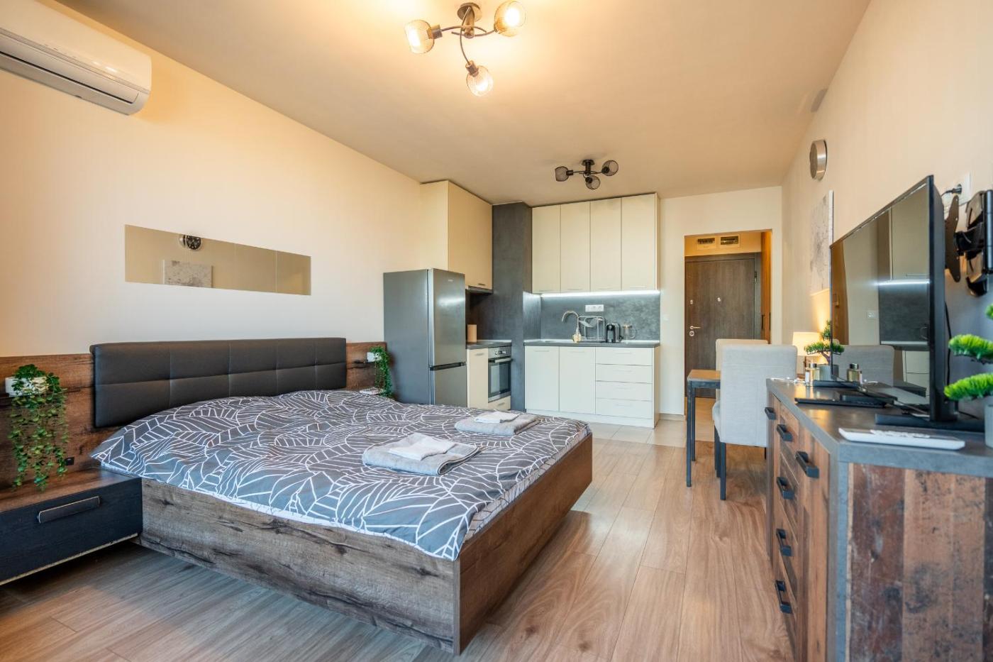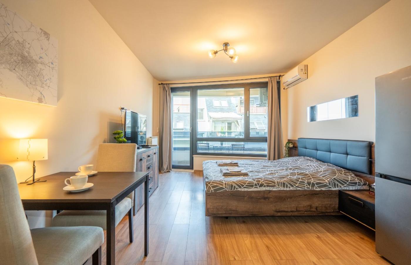 One-Bedroom Apartment. The air-conditioned apartment has 1 bedroom and 1 bathroom with a shower and a hairdryer. The kitchen features a stovetop, a refrigerator and an oven. The apartment features parquet floors, a seating area with a flat-screen TV, a washing machine, a tea and coffee maker as well as city views. The unit has 1 bed.