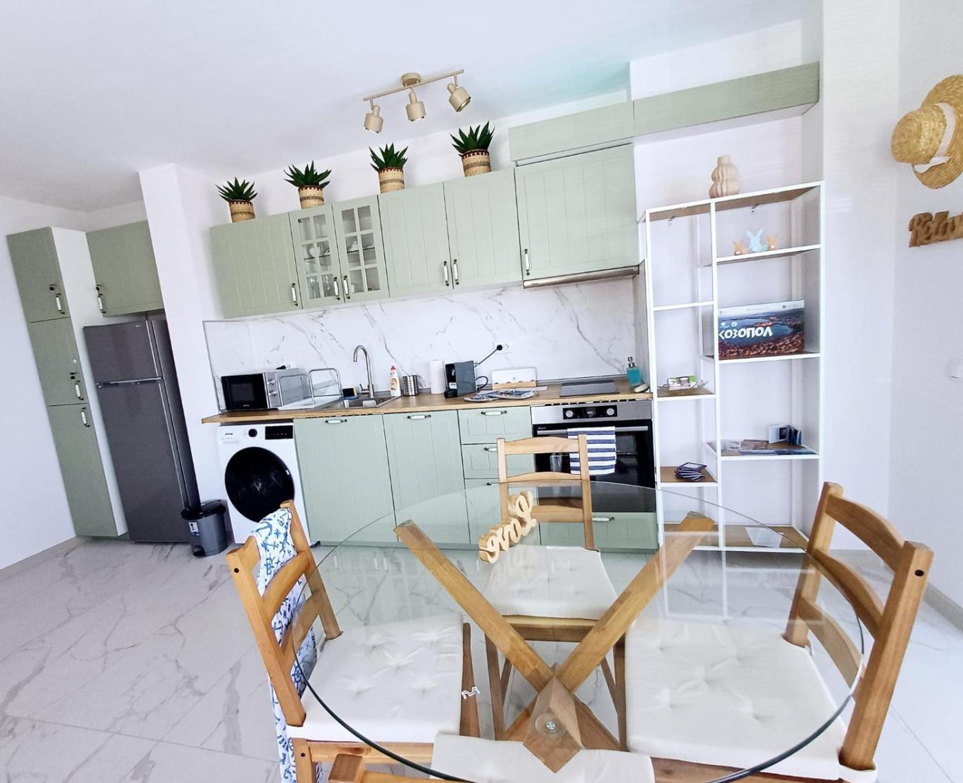 One-Bedroom Apartment. The air-conditioned apartment has 1 bedroom, 1 bathroom and a kitchen. The apartments kitchen is available for cooking and storing food. Boasting a balcony with sea views, this apartment also features a washing machine and a flat-screen TV. The unit has 2 beds.