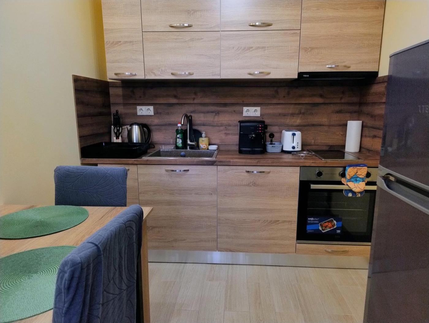 The apartment provides guests with a terrace,courtyard views, a seating area, cable flat-screen TV, a fully equipped kitchenette with an oven and a microwave, and a private bathroom with bidet and slippers. A toaster, a fridge and stovetop are also offered, as well as a coffee machine and a kettle. At the apartment complex, units include bed linen and towels.